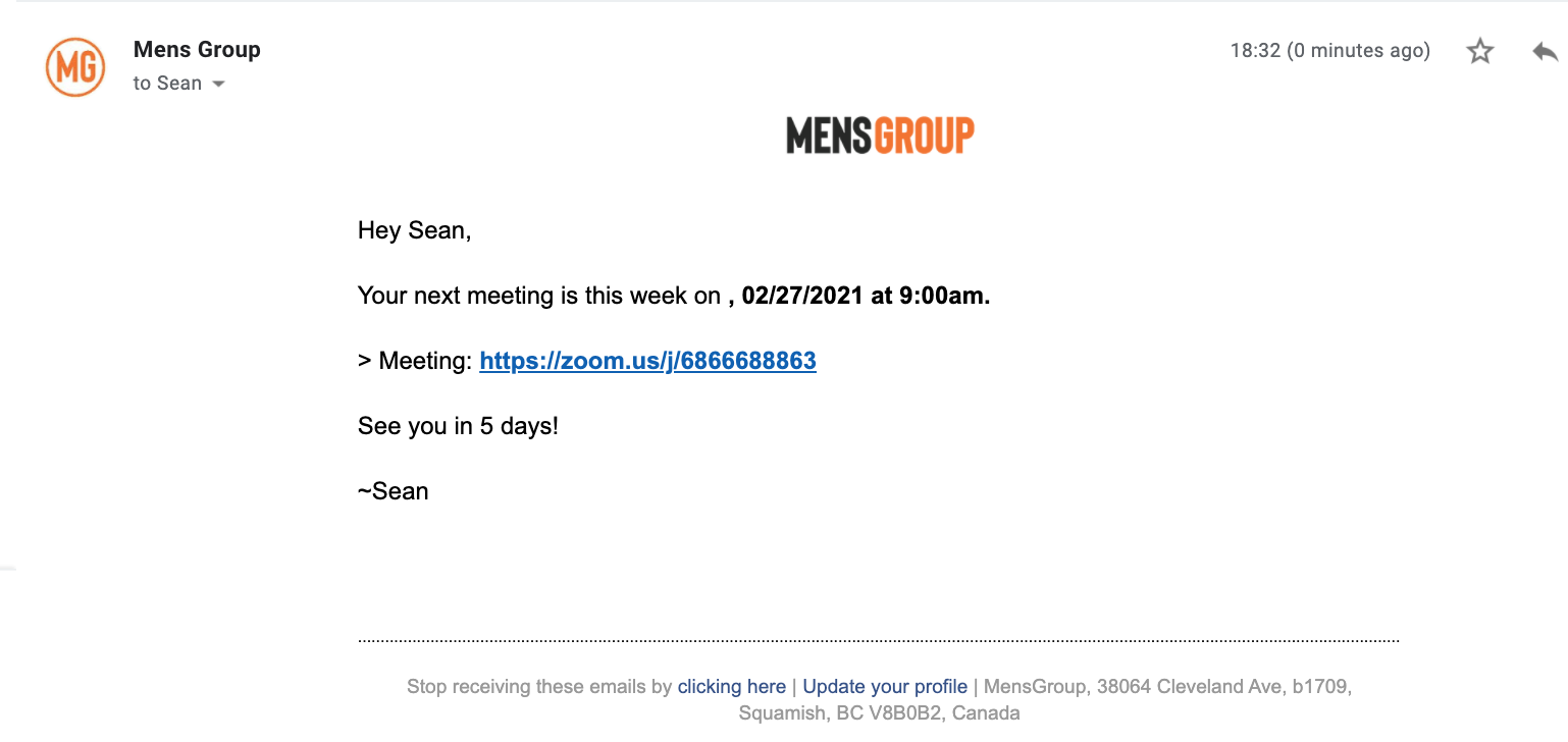 The emails have you meeting day, time and date. It also has your unique meeting link.